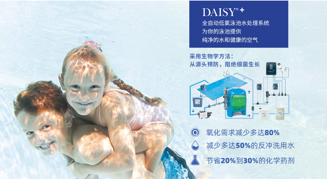 傳統的水處理嘗試投放高劑量的氯、紫外線或臭氧來解決這一問題,但細菌的生長是一個生物學問題,需要一個生物學的解決方案,也就是: DAISY+!這是一套完整的泳池水處理系統,其中所有組件一起工作以提供能夠產生清澈安全的水和健康的空氣條件的系統。以將水中細菌生長所需要的物質進行過濾去除掉,用一種健康的方式消滅了泳池中的細菌。同時在過濾中使用AFM濾料,過濾效能達到1微米,能夠有效去除水中的雜質。這套系統是新穎且可持續和經濟的泳池水處理系統.