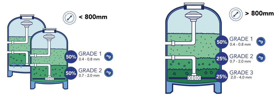 對于較小的過濾器(< Ø 800 mm 直徑)和所有帶有噴嘴板床的過濾器,無論過濾器直徑如何:使用 50% 的AFM®ng1 級和 50% 的 AFM®ng2 級。